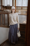 腰まわりはすっきりと、裾にかけて切り替えを入れることで、動くたびに自然な立体感に。ティアードデザインでありながら、広がりすぎず、あくまで静かなボリューム感を意識しています。